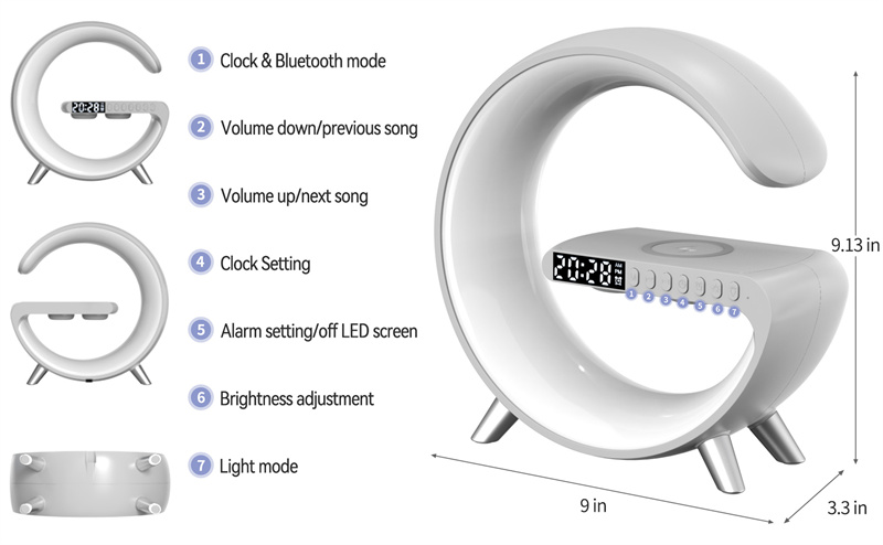 1. Multifunctional Wireless Charging Atmosphere Light: The lamp is not only an atmosphere light but also has 15W fast wireless charging, Bluetooth speaker, music, sleep light, atmosphere light, bedside light, glare effect, Bluetooth audio, clock, alarm clock, and other functions.